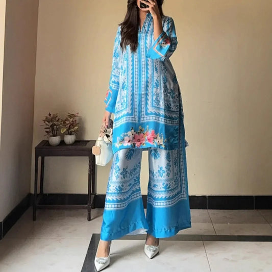 طقم بالازو من الساتان الفاخر بنقشة زرقاء ملكية