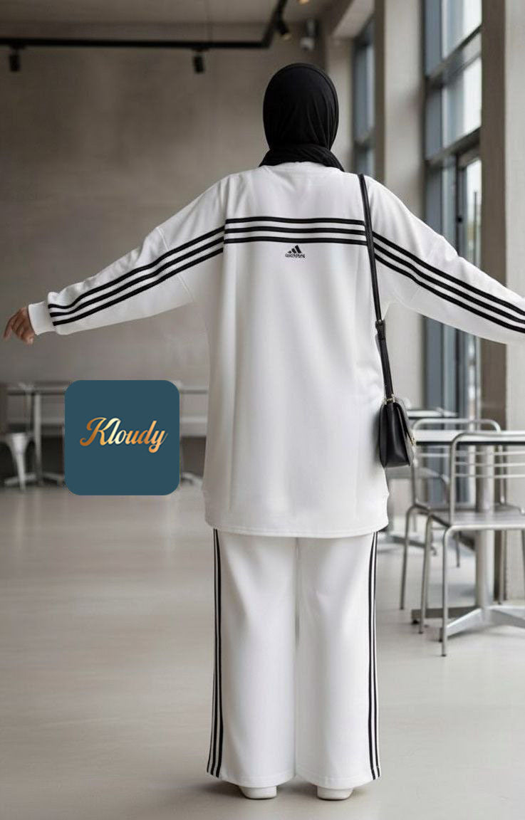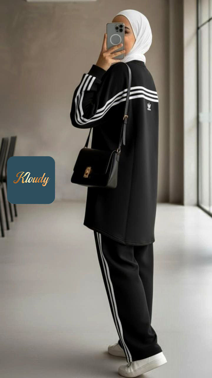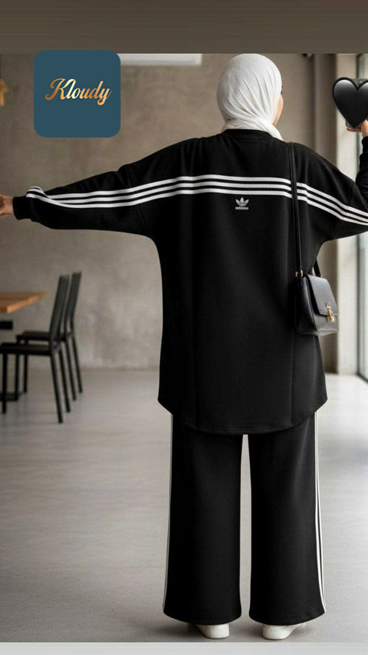• السروال: يأتي بقصة واسعة ومريحة مع خط أديداس، مما يزيد من أناقة الطقم ويمنحكِ إطلالة مميزة.
